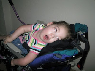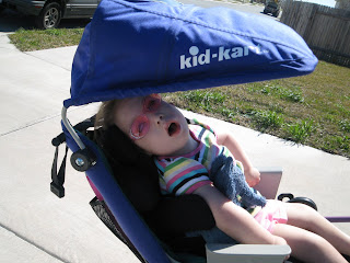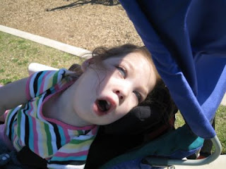 The weather has been beautiful this week. Today it was a little cool breeze and a sunny 84 outside. Since Casey has been adjusting better to her chair we really want to try and get her outside as much as we can this summer. So today was a perfect weather day and she was doing good so we took a walk down to the pool and back. Casey did great! And, of course, she looked style’n the whole way.