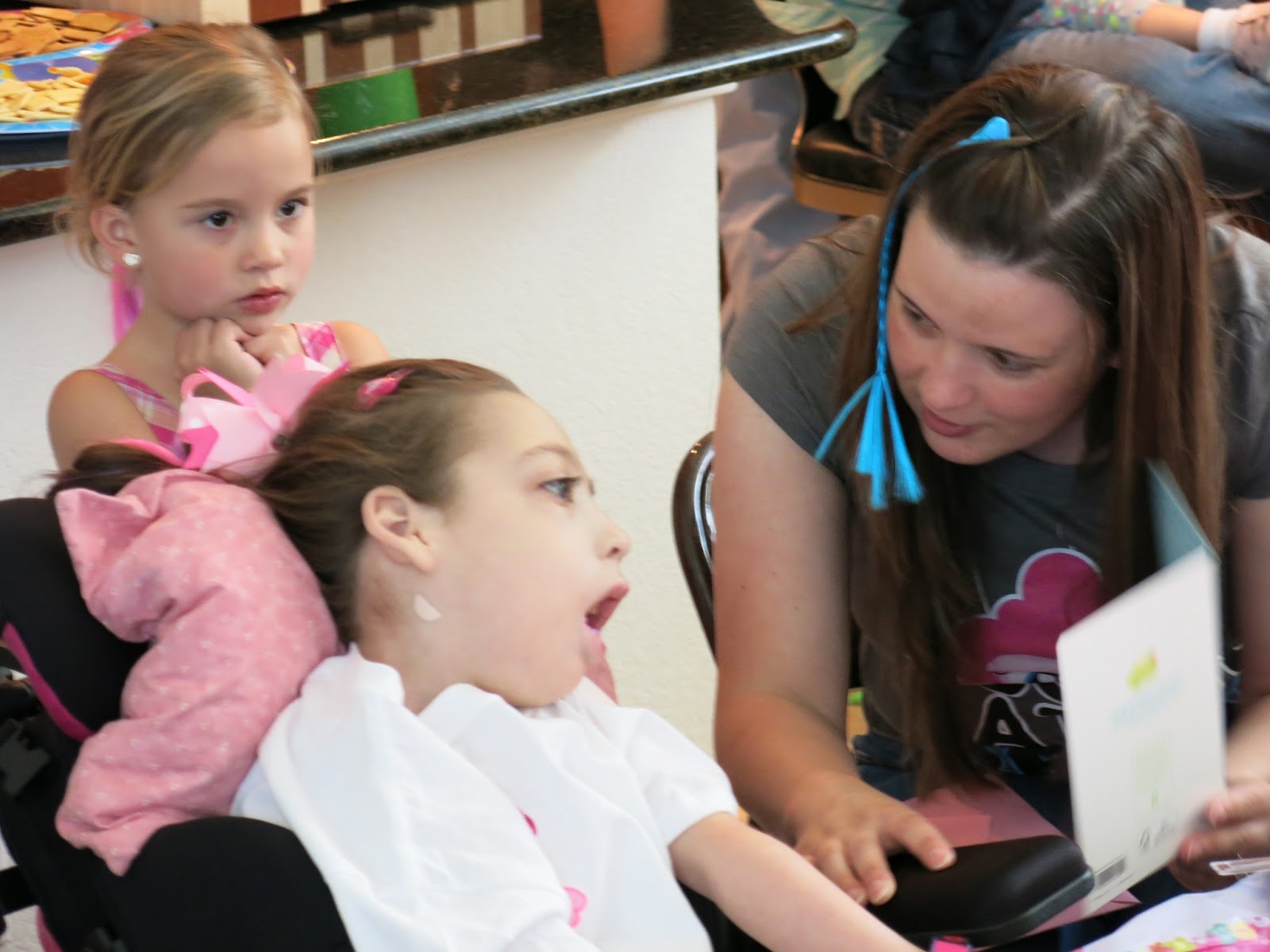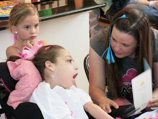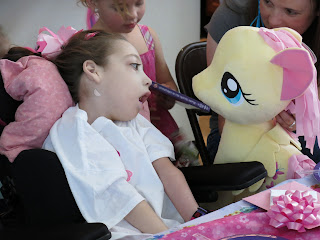 Casey has been getting stronger by the day. After a great week we decided she was up for her birthday celebration with her friends. She was so excited last night about seeing her friends that she could not even get to sleep. She got all dressed up today in her My Little Pony dress, the matching hair bow, her pink/purple hair extensions, the whole nine yards. She looked awfully cute.