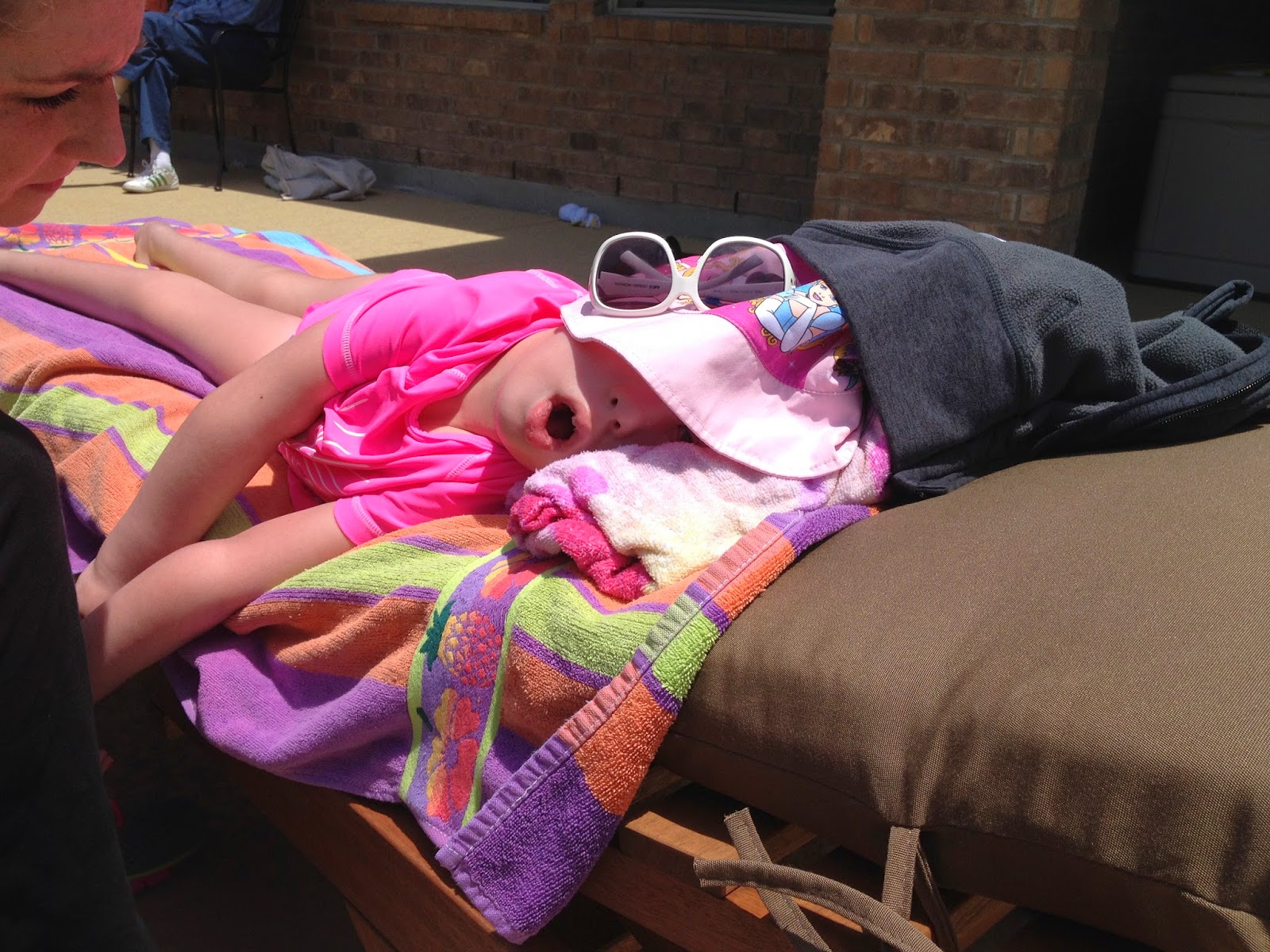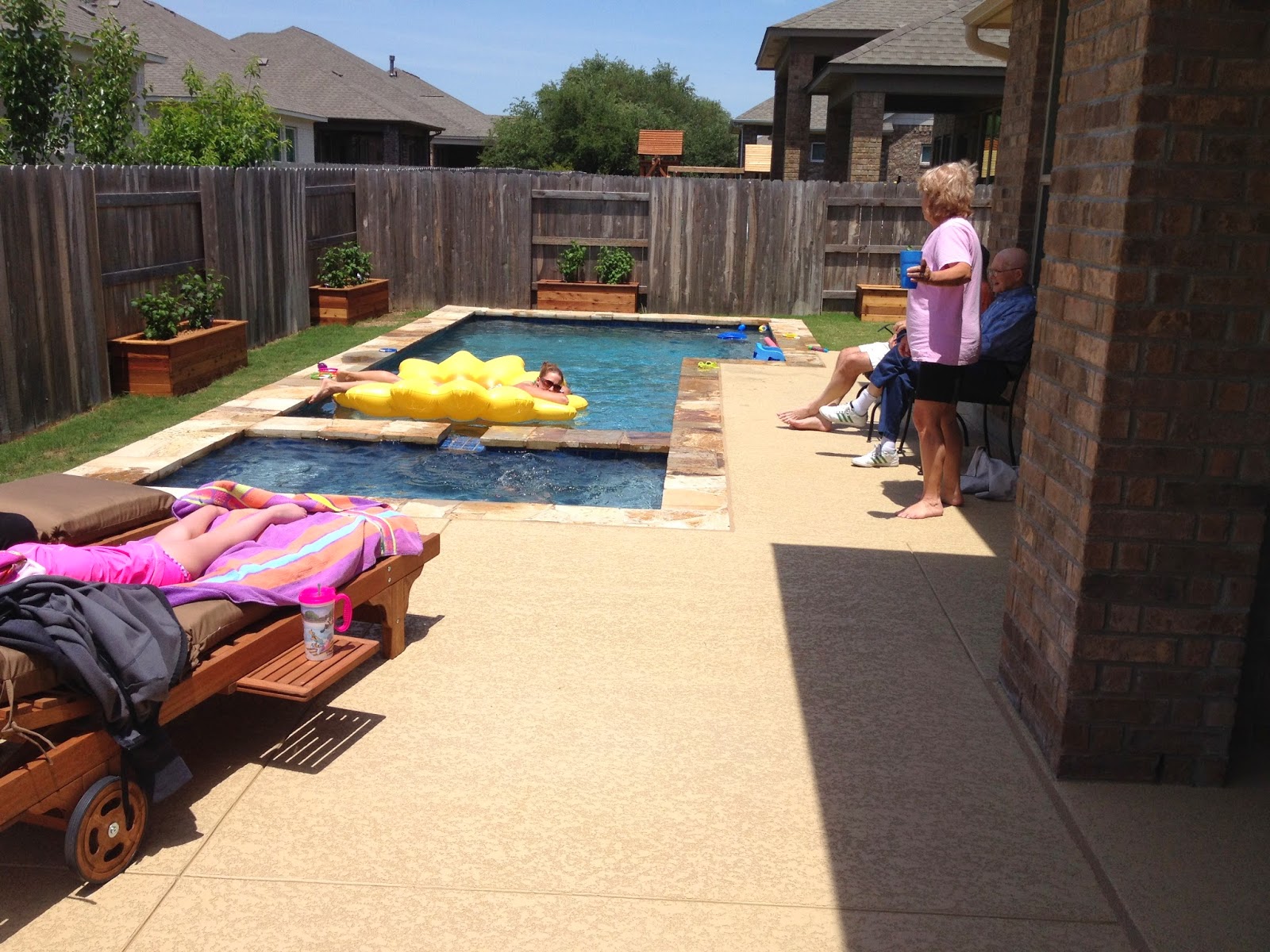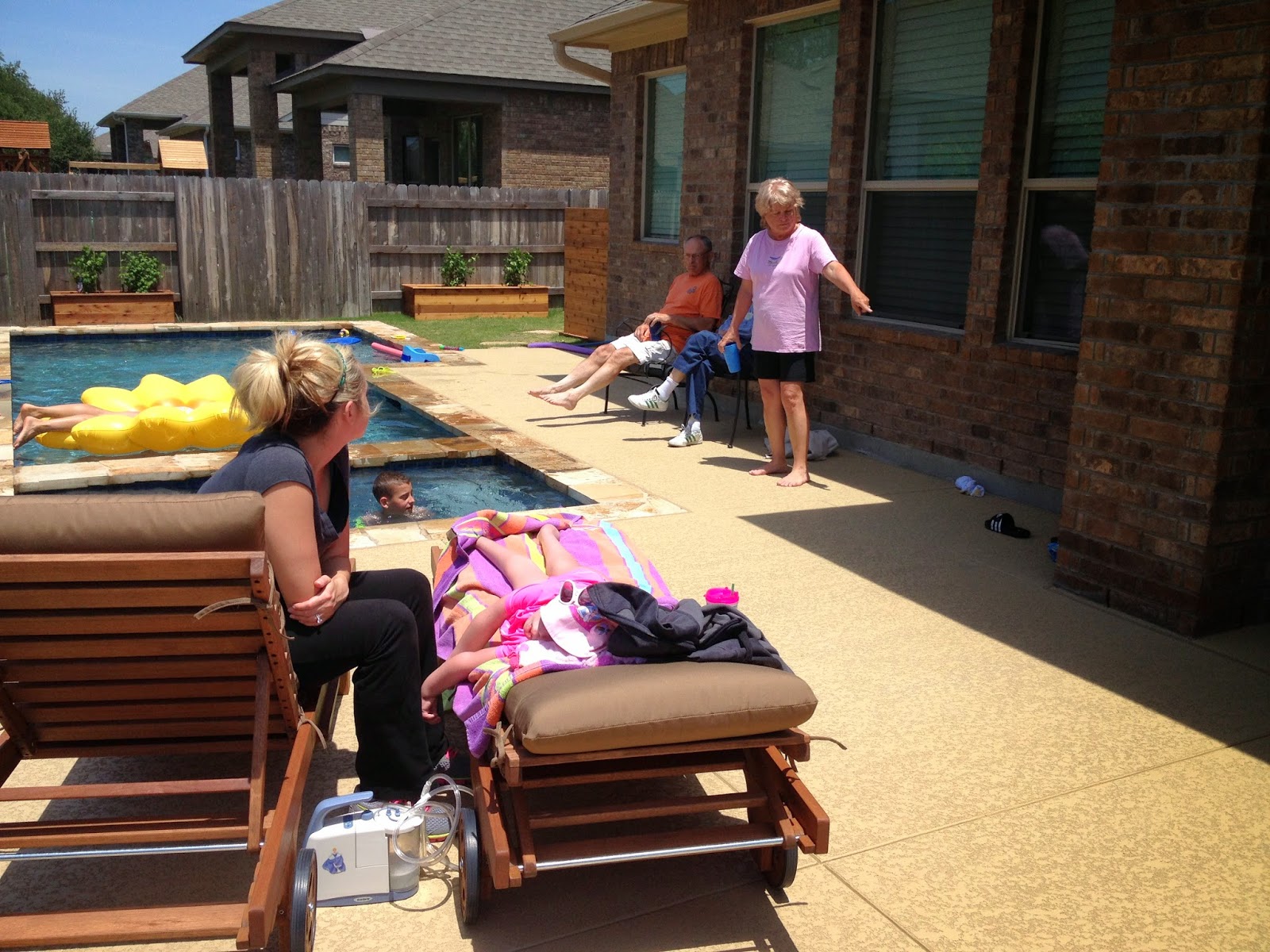 My grandpa, Casey’s great grandpa, had his Honor Flight Meet & Greet (orientation) meeting early Saturday. My mom and John took him while Tim and I got stuff done around the house and Casey hung out with her nurse. My sister and her little boy, Riley, came in just after lunch. They drove in from Dallas and he wore his swimsuit the whole way so that he could go straight to the pool. My other sister came up and when my mom, John, and grandpa all got back we had burgers out by the pool. Every time we tried to bring Casey in for a break or to get out of the sun she would just yell and complain until we took her back out. If anyone was in “HER” pool, she thought she needed to be there too. She started to get pretty pink and had tan lines after a little while, so we did eventually make her come back in. I think if it were up to her and Riley they would have been out there sun up until sun down.
