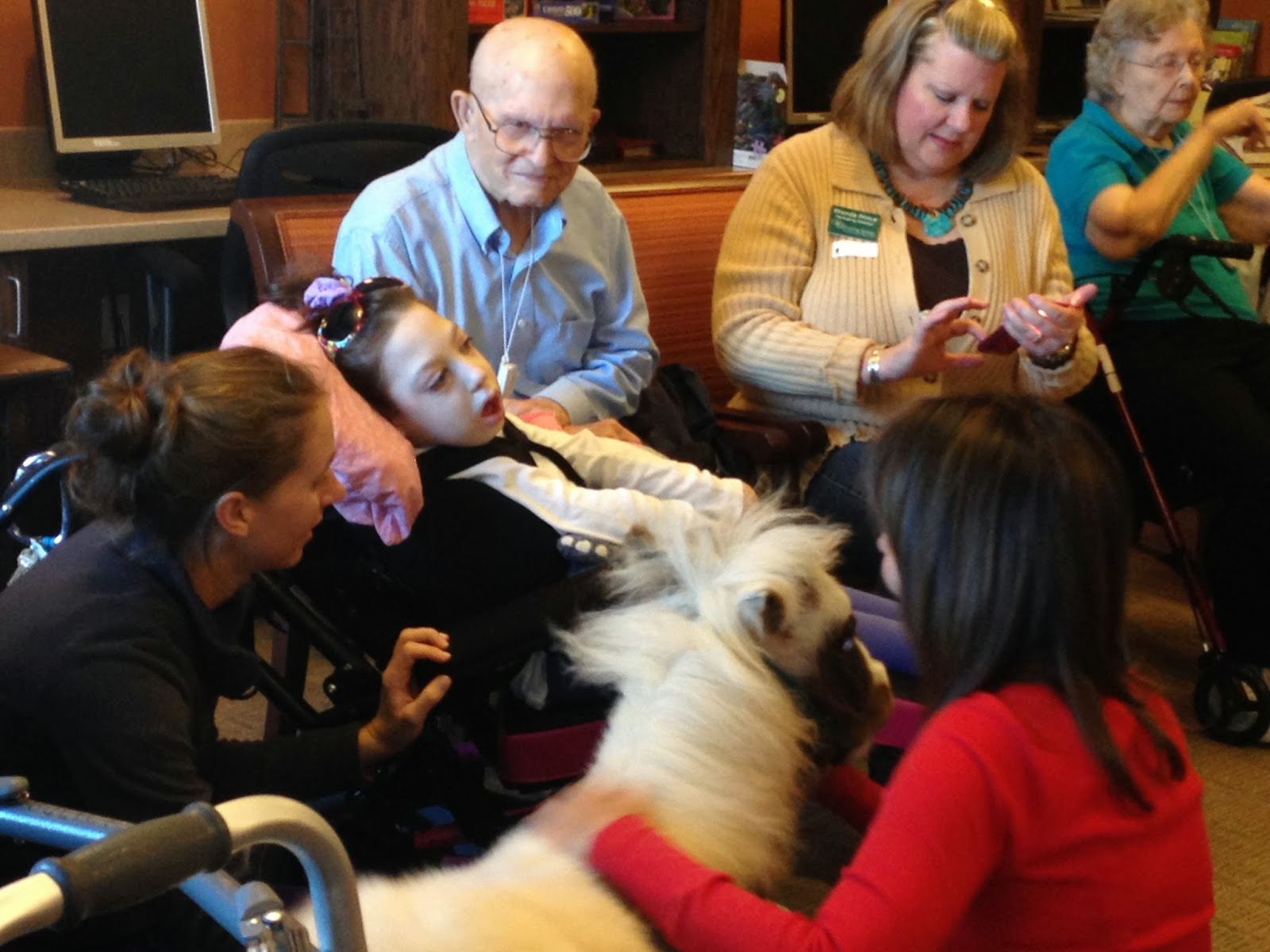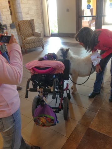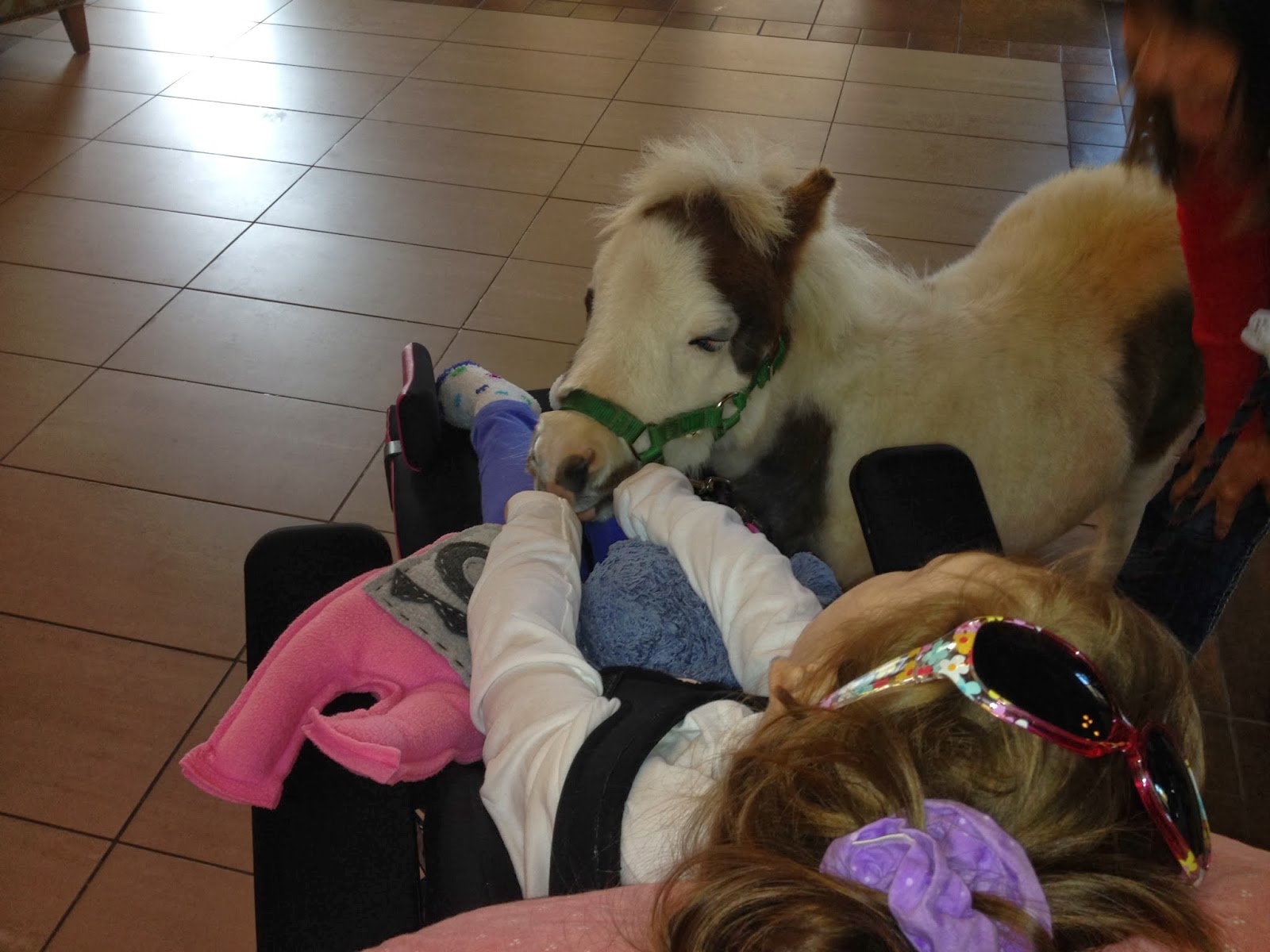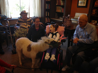 After Halloween my mom and her husband (Cappy and Grandpa John) came in to town so that we could move my grandpa (GP) to a new assisted living facility closer to us. The move went pretty well. It was much easier than moving him into assisted living a couple of years ago for sure. The new place is much bigger and more active. This week they have a theme week of ‘Country Western’. They invited Casey to come over today while they had miniature ponies visiting. Casey and GP had a great time. They had 2 ponies. The bigger one Casey didn’t seem to care much about, but the little one and her hit it off. The little one came over and laid her head on Casey’s lap. Casey was able to pet the ponies head. The pony did not want to leave Casey’s side. They had to pull her away. When we were leaving the building the pony was by the front door. It came right back to Casey and gave her some more snuggles. I think it’s safe to say Casey made a new friend today. This girl loves her ponies.