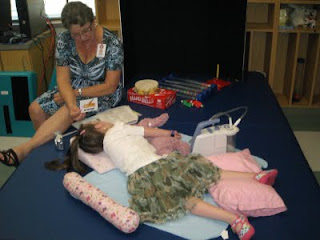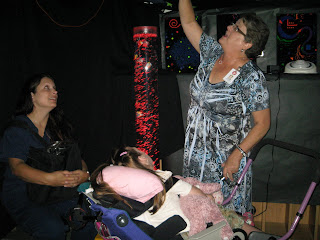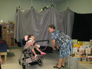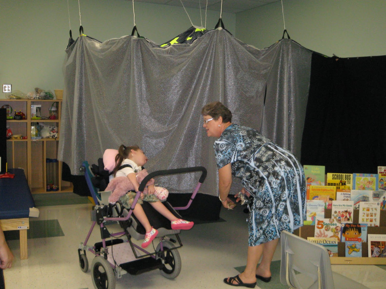 After the tour Casey made it to her classroom. The sensory area was ready. Officially the sensory area, unofficially it is called the princess tent. There are a lot of special tools that light up, and respond to sound and motion that are great for keeping Casey’s attention. The school put up a black out tent around a corner of the room. The top of the tent is actually a parachute with neon yellow stars. Then, in order for it to not just be a boring black tent, Casey’s teacher wrapped it in sparkly fabric. The sparkles are princess approved 🙂