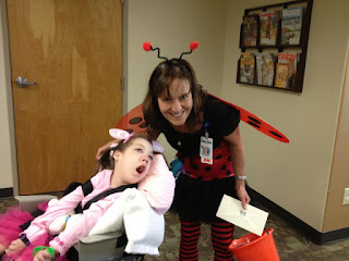 Casey LOVES Halloween. Each year we get Casey dressed up and deliver goodies to all of her doctors. She has so much fun. It’s nice to see the doctors for fun reasons as opposed to a patient. The staff loves getting to see Casey all dressed up. We have done it enough years now that some of them expect us and look forward to the visit.