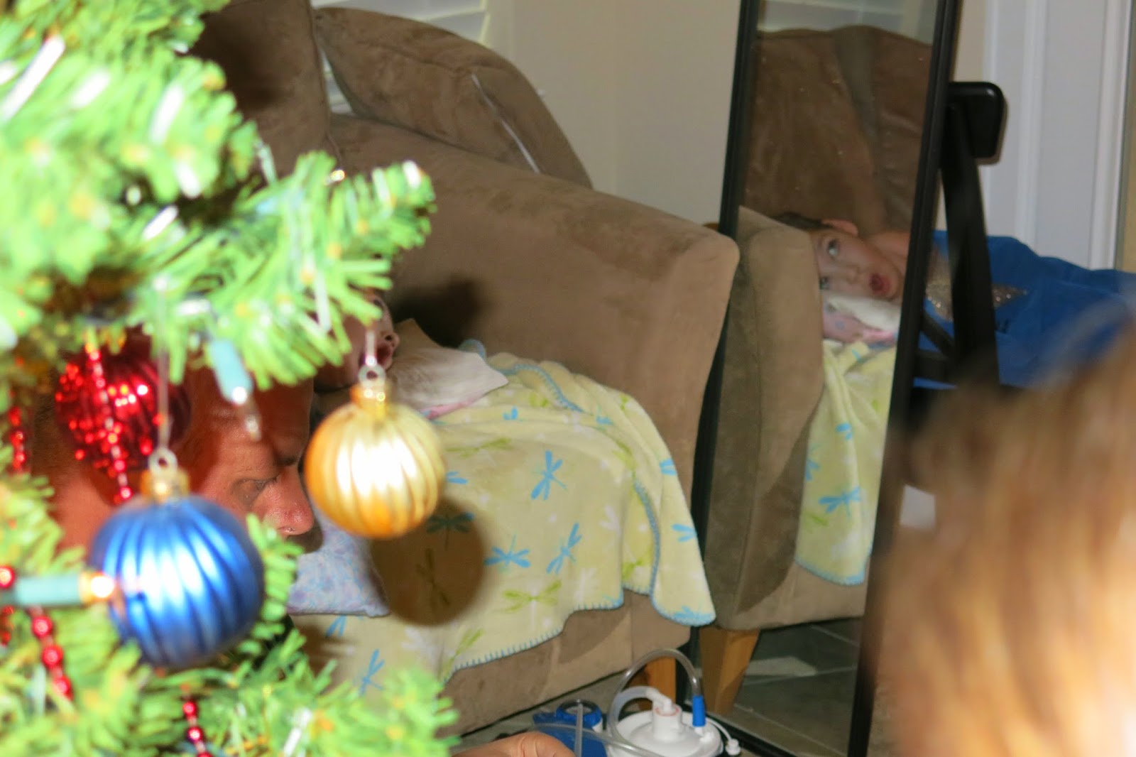 The following Friday we decorated the tree. Casey LOVES Christmas lights so we usually get the tree up as soon as we can after Thanksgiving. We set it up so that she could watch and direct us from the catch near the tree by using a mirror in her line of site. It worked really well. There were a few ornaments she had very specific ideas about and let us know if we put them in the wrong spot.