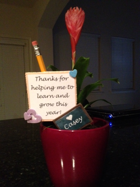 When Casey got to class her teacher had all kinds of treats planned. Casey got extra time in the princess tent (sensory area), they read stories, made pictures, all of Casey’s favorite things. Her teacher sent her home with a basket full of art supplies too. Enough to keep Casey busy for a while. Thanks to my addiction to Pinterest, I found a really cute teacher gift that even I (the craft challenged) was able to make. Casey loves to give people presents. I hope that her teacher liked it.
