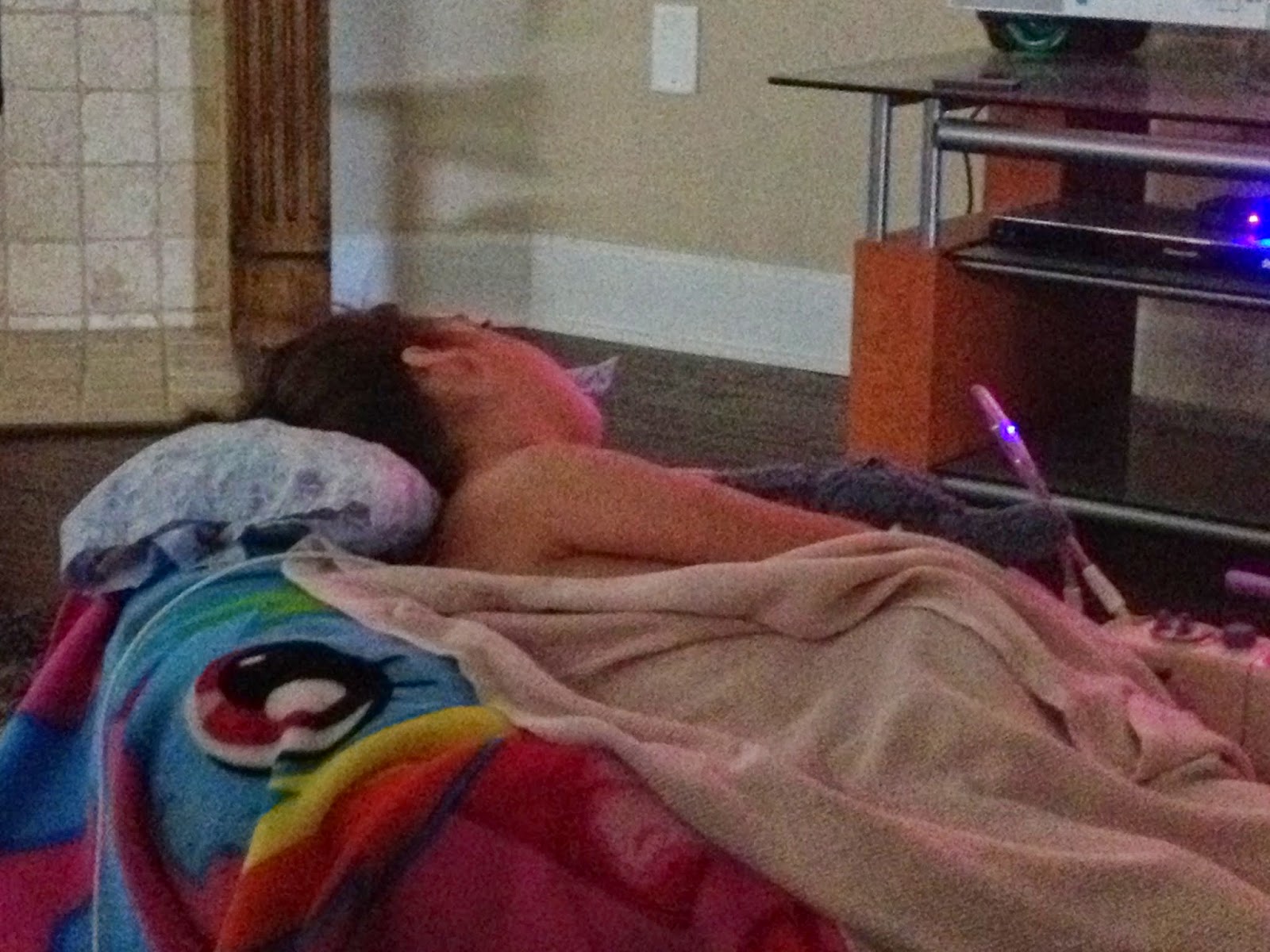 On Saturday after getting her out of bed she was doing some of the pain crying again and her heart rate was going up. We decided to play it safe and kept her home from her last day of dance camp. We made the right call. As the day went on she got more and more agitated. She started spiking fevers, she was crying, screaming, it was a horrible day! The night was not any better. With morphine and tylenol we could not get her heart rate to come down. Casey ended up needing oxygen since breathing with everything else was too much work for her. We could not seem to get her fever down either. Then Sunday morning she had a really loose stool early in the morning and it was beyond stinky.