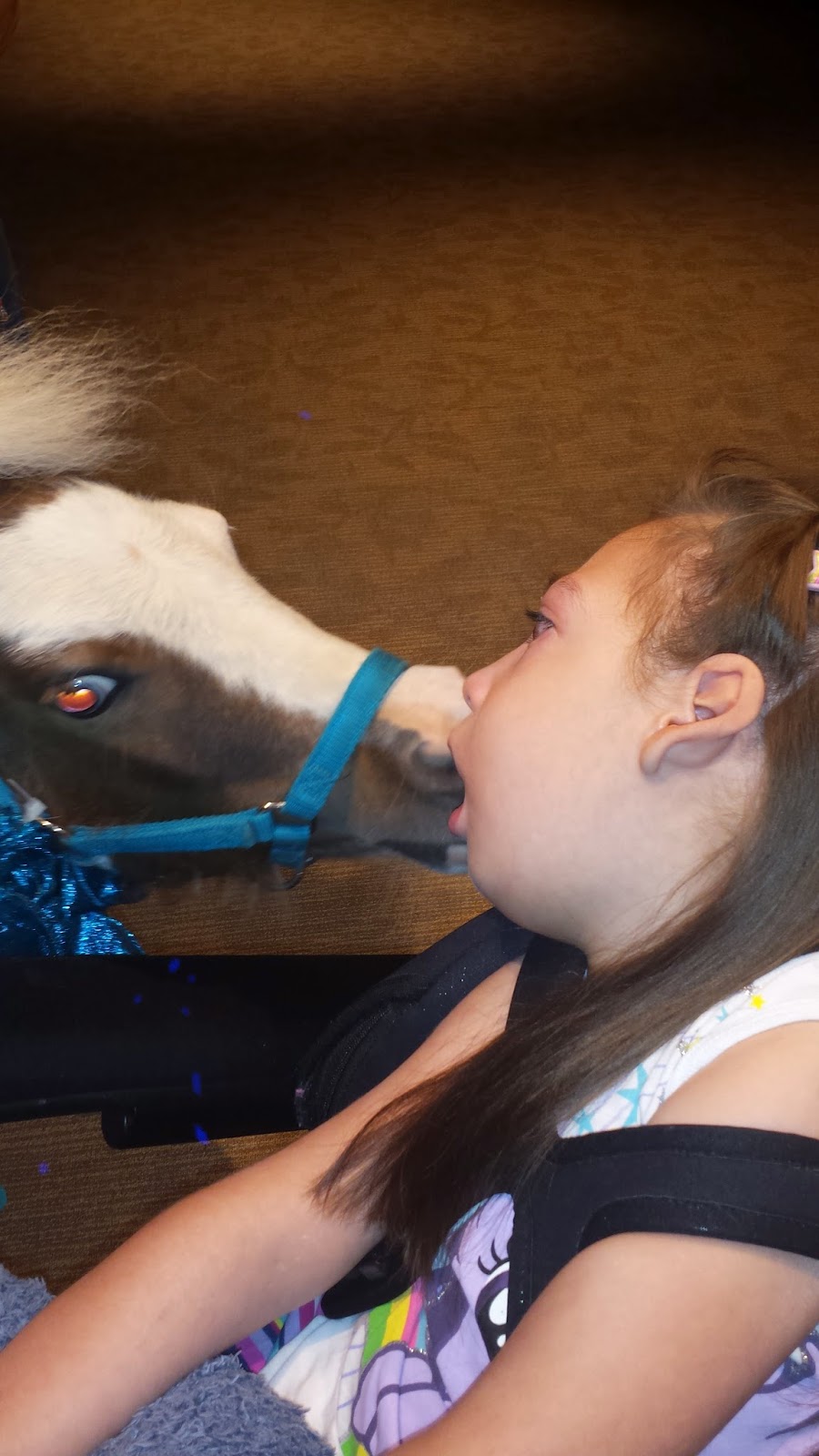 On Tuesday she woke up in a great mood and seemed to feel much better. My grandpa invited her to come over to his place because the miniature horses that she loves so much were coming by for a visit. Casey loves to visit Great Grandpa and she loves horses, so she was pretty excited. As soon as her little friend, Mercy- the smaller horse, saw her I am not sure if Casey or Mercy were more excited. Mercy gave Casey lots of kisses on both of her cheeks. Then she wanted Casey to pet her and to snuggle. Casey had her hands on her elephant that was on her lap. Mercy tried to move Ellie out of the way so that Casey could pet Mercy. It was really cute. Casey had a great time. After she stayed to visit with Great Grandpa a little bit and meet some of his friends. She went home and spent some time in the pool that afternoon. It was a great day.